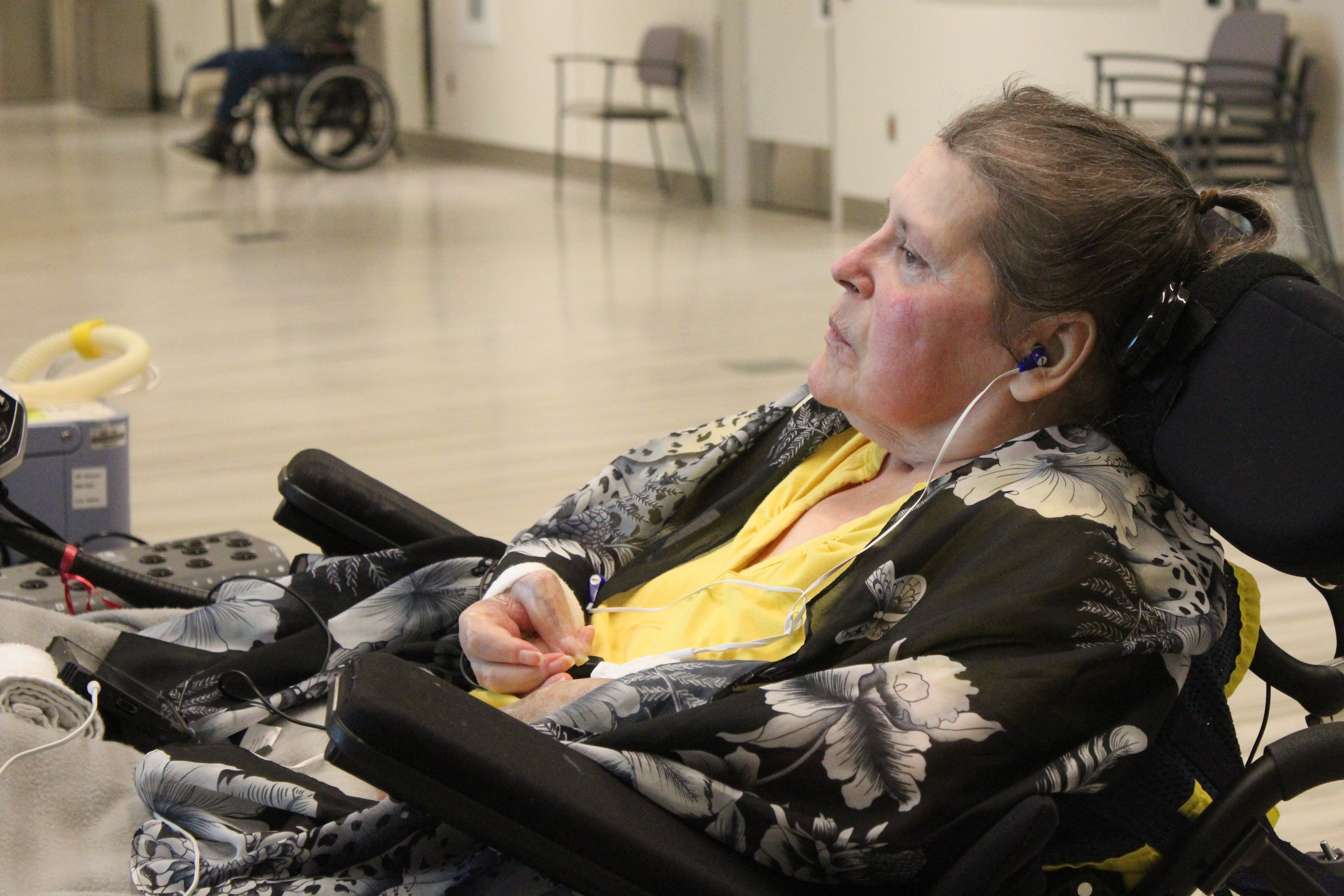 Rachel Armstrong, an inpatient since 2019, has very limited mobility in her hands, so the team set her up with the “smallest controls they had,” Rachel says. “The other ones are too big, or they move away from my hands, so we had to find something that would stay put.”